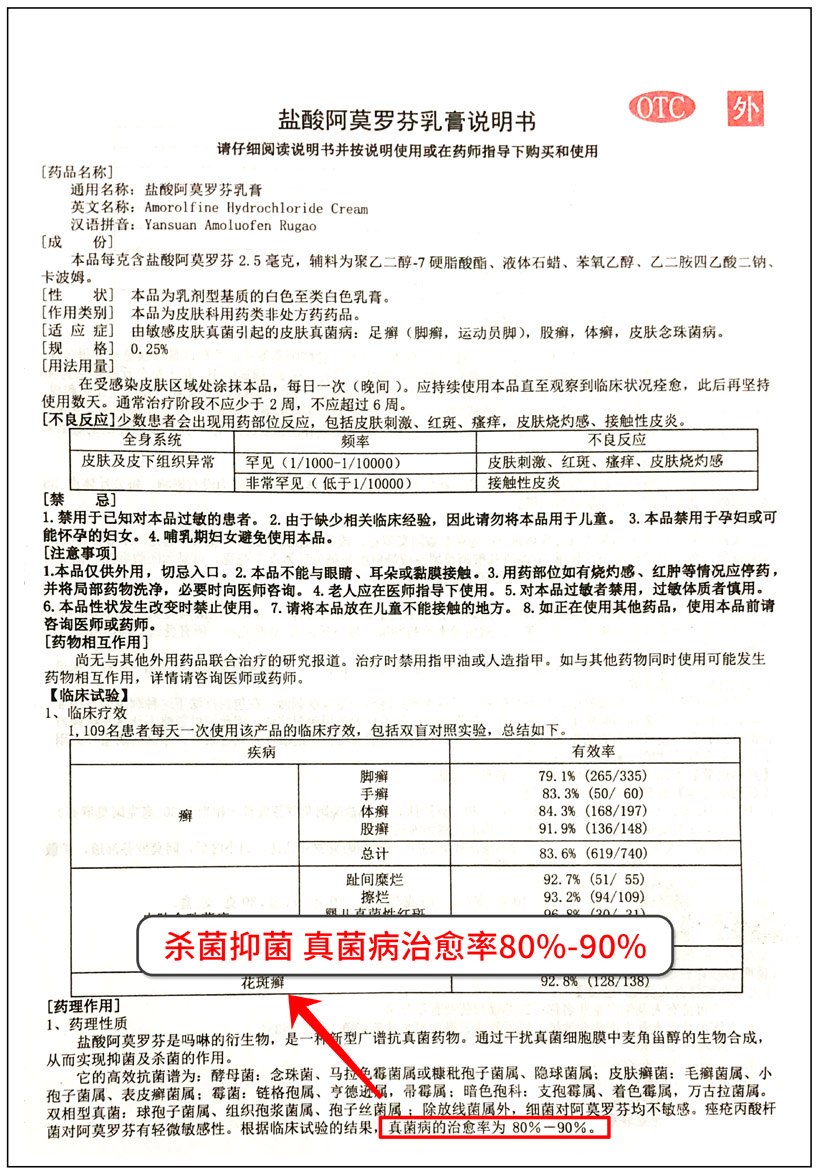 【产品名称】 【成 份】 【性 状】 【适 应 症】 【规 格】 【包 装】 | 通用名称:盐酸阿莫罗芬乳膏 英文名称:Amorolfine Hydrochloride Cream 汉语拼音:Yansuan Amoluofen Rugao 本品每克含盐酸阿莫罗芬2.5毫克; 辅料为聚乙二醇-7 硬脂酸酯、液体石蜡、苯氧乙醇、乙二胺四乙酸二钠、卡波姆; 本品为乳剂型基质的白色至类白色乳膏。 由敏感皮肤真菌引起的皮肤真菌病:足癣(脚癣,运动员脚),股癣,体癣。皮肤念珠菌病。 0.25% 铝管包装, 10 克/支/盒,15 克/支/盒,20 克/支/盒 【用法用量】【不良反应】【禁忌】【注意事项】等详见说明书。 |