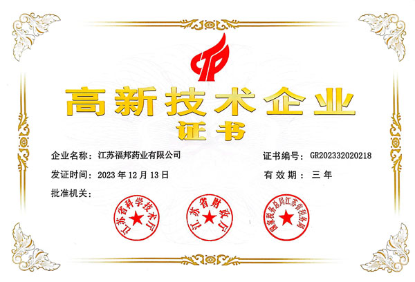 江苏福邦药业通过高新技术企业认证